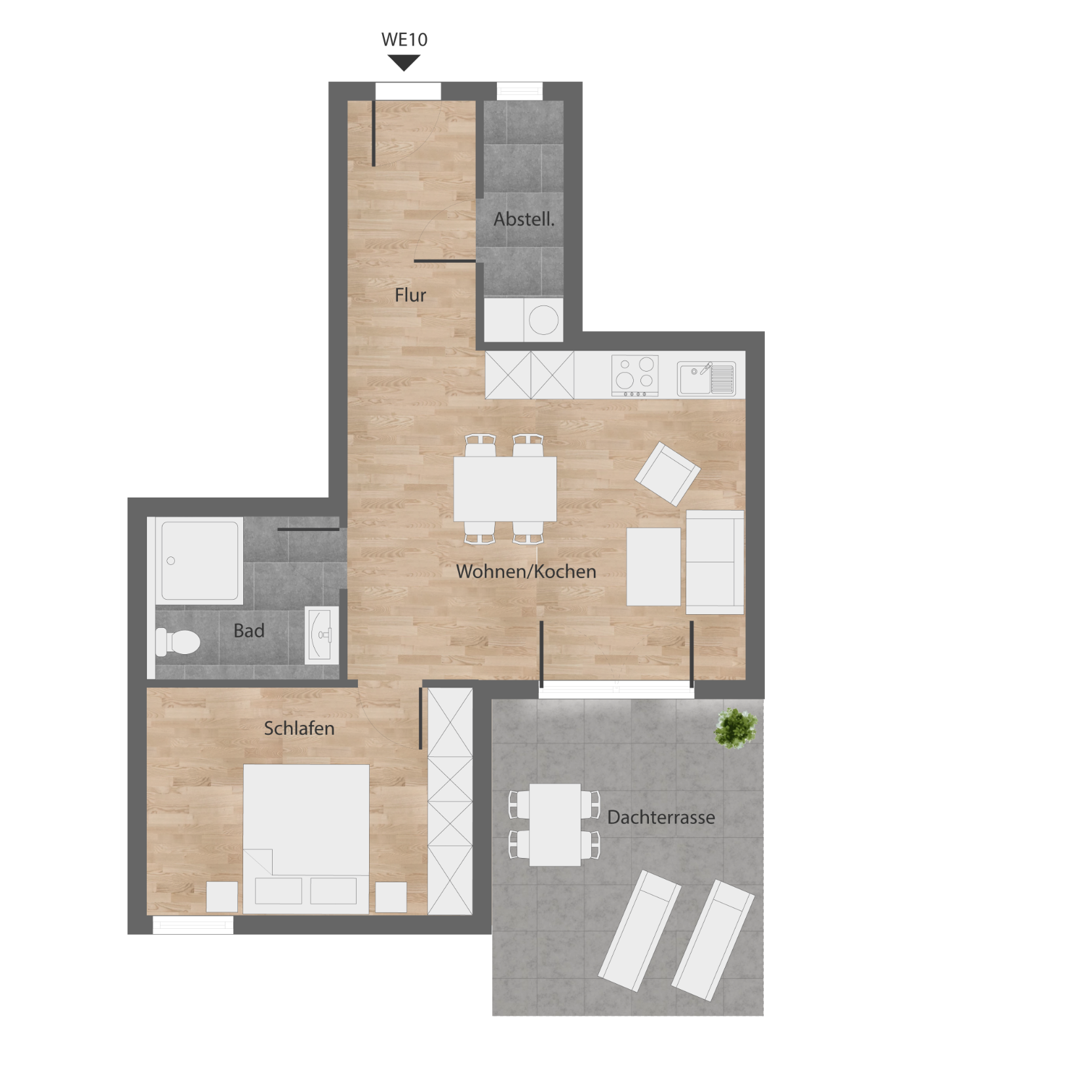 Je Wohnung ist wahlweise eine Garage oder ein Stellplatz vorgesehen. Die Kosten betragen 15.000 € für eine Garage bzw. 7.500 € für einen Stellplatz. Darüber hinaus verfügt jede Einheit über einen eigenen Abstellraum, der zusätzlichen Stauraum bietet.