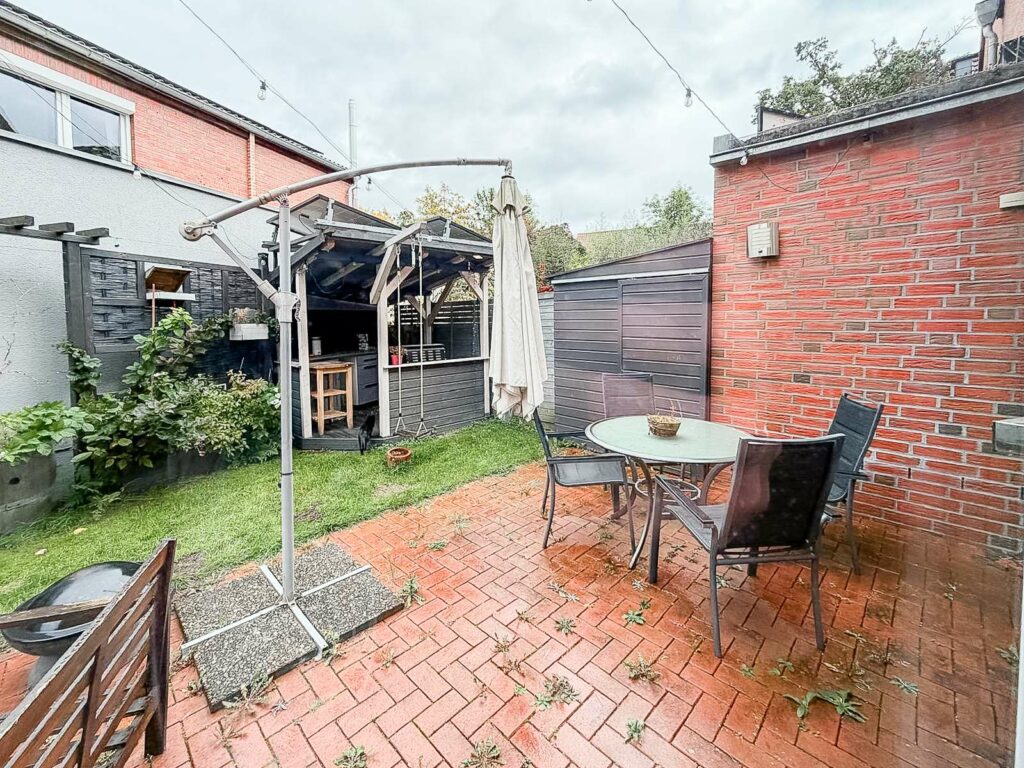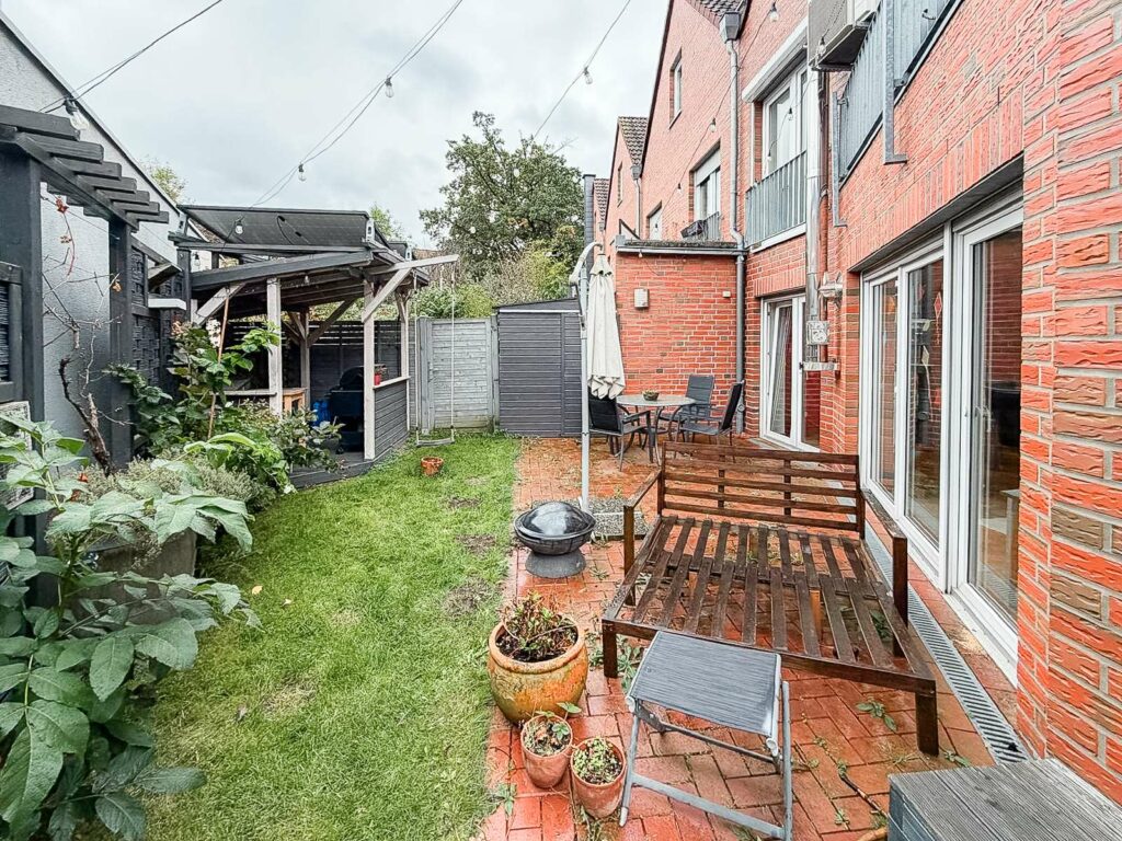 Der liebevoll gestaltete Garten vermittelt mit rund 105 m² Nutzfläche einen urbanen Hinterhof-Charme. Eine Outdoorküche, Hochbeete, Bewässerungsanlage und weitere Elemente können nach Absprache und gegen Abstand übernommen werden. Ein überdachter Bereich bietet regengeschützten Platz für Fahrräder und Gartenutensilien. Zusätzlich steht ein kleiner, abschließbarer Anbau als Ersatz für einen Kellerraum zur Verfügung.