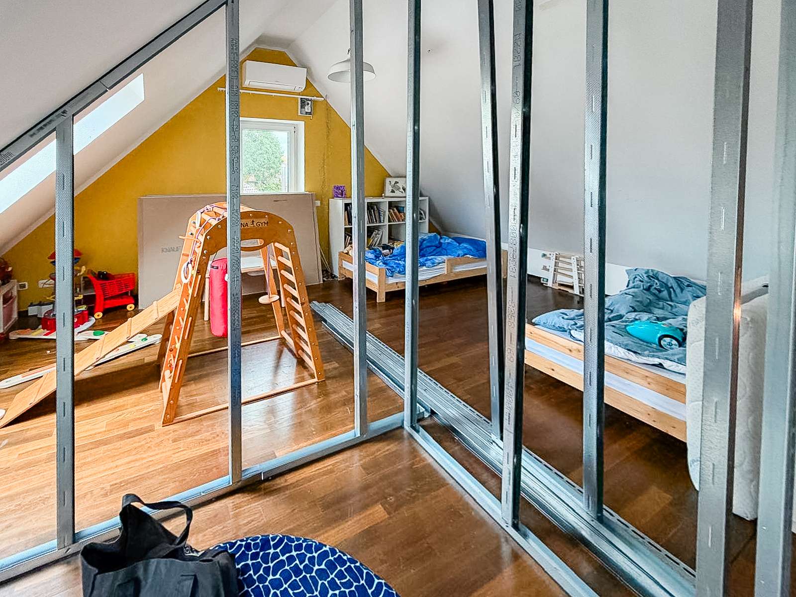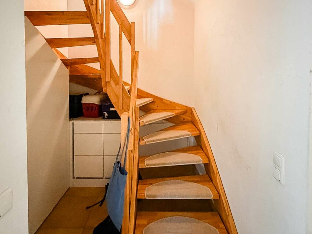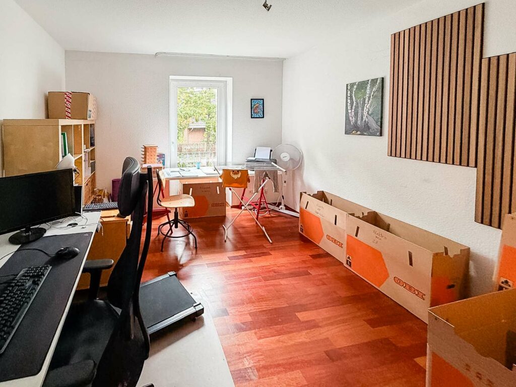 Im ersten Obergeschoss befinden sich drei etwa gleich große Zimmer, die sich flexibel als Schlaf-, Kinder- oder Arbeitszimmer nutzen lassen. Eines der Zimmer verfügt über einen kleinen Balkon. Das moderne Familienbad bietet Platz für Waschmaschine und Trockner. Das ausgebaute Dachgeschoss beeindruckt durch ein großzügiges Studio mit Klimaanlage, ideal als Schlaf-, Arbeits- oder Gästebereich. Ein weiteres Badezimmer mit Badewanne sowie ein Heizungsraum mit zusätzlichem Stauraum vervollständigen das Raumangebot im Dachgeschoss.