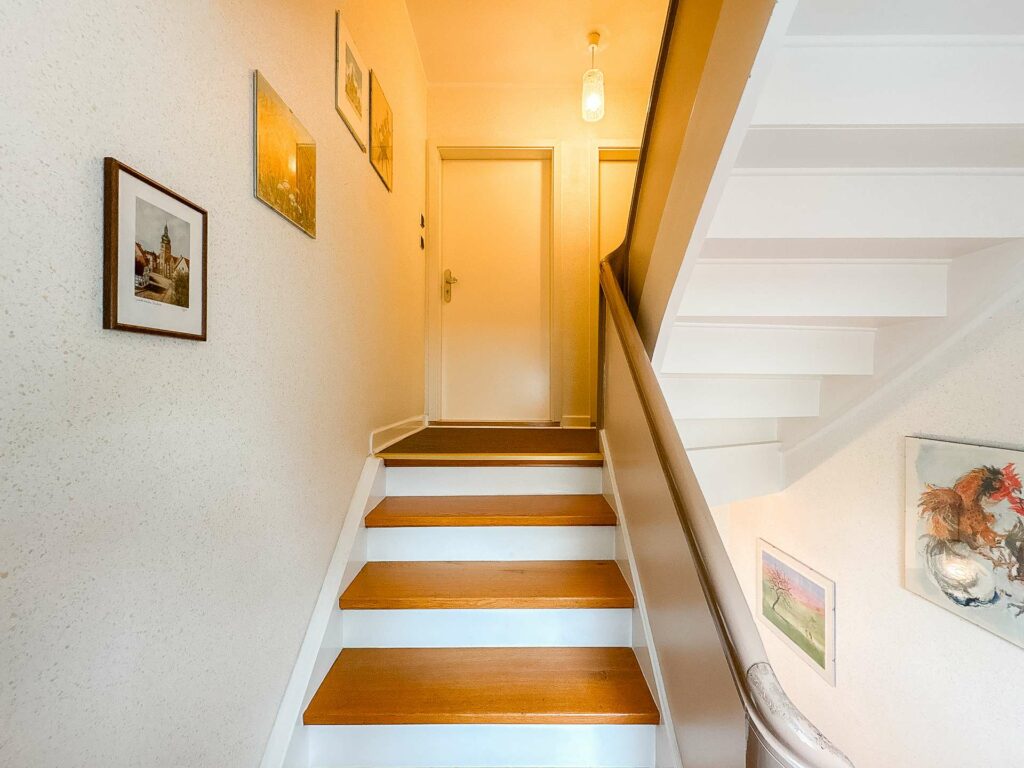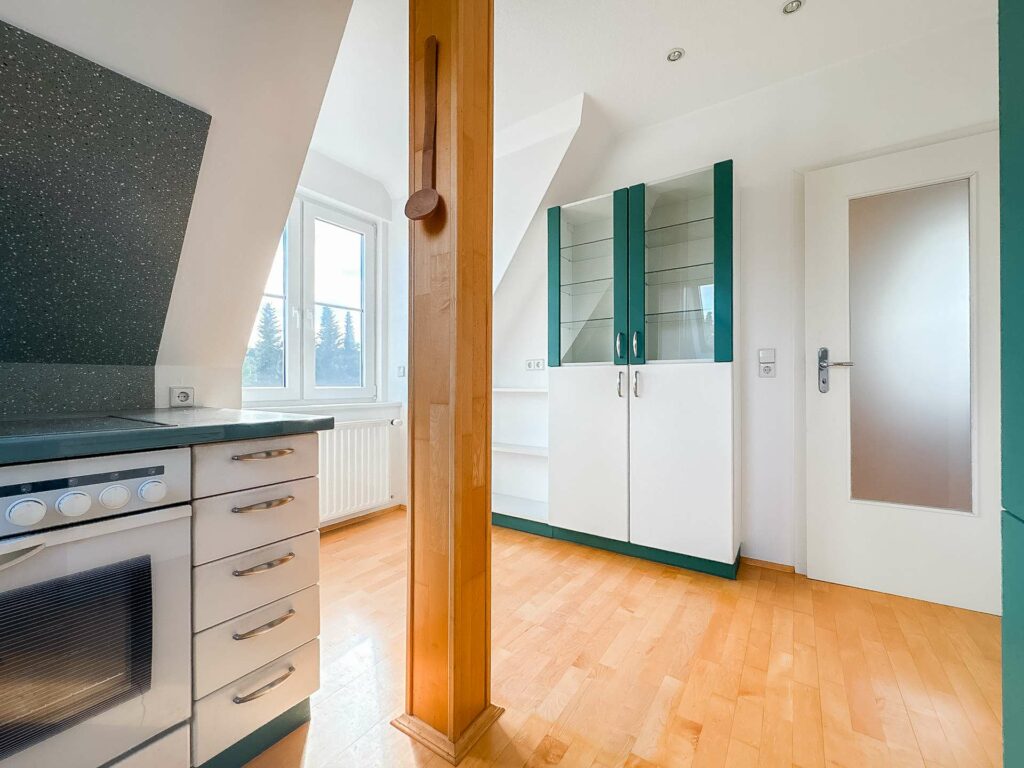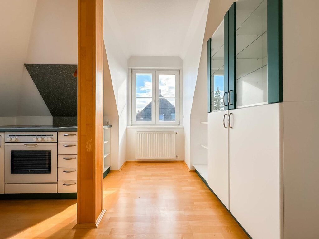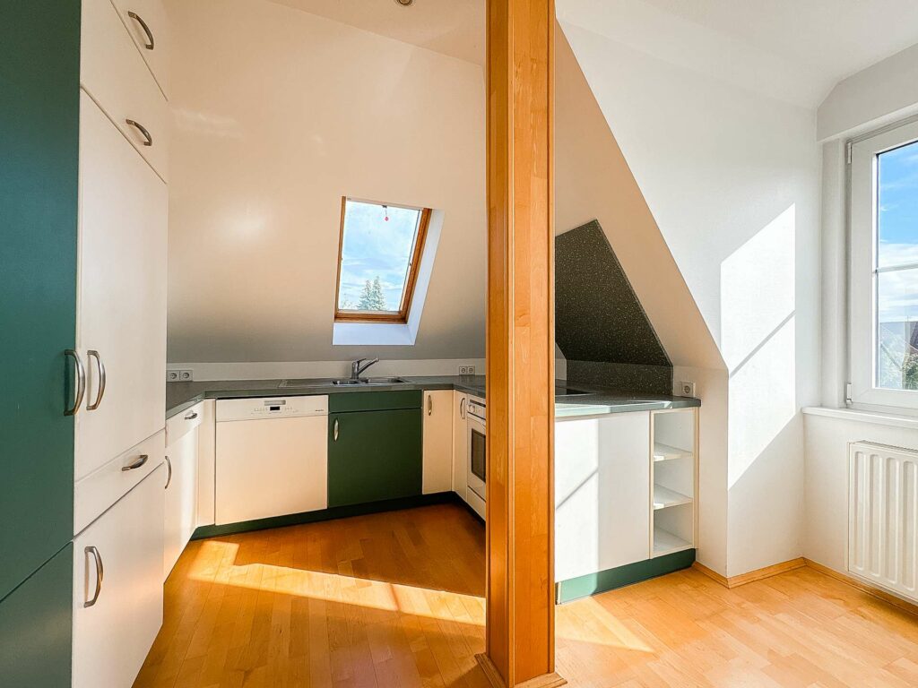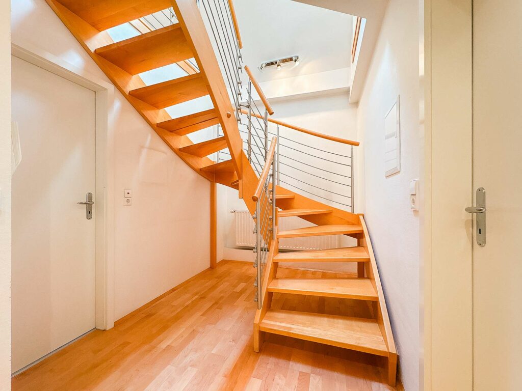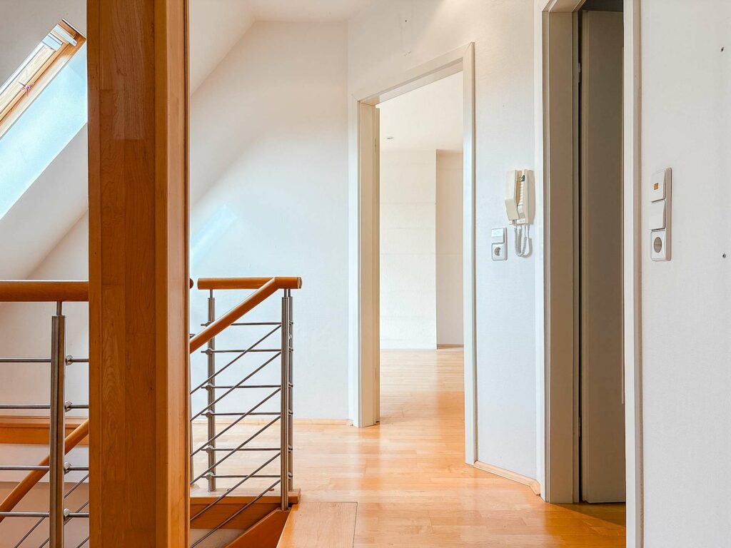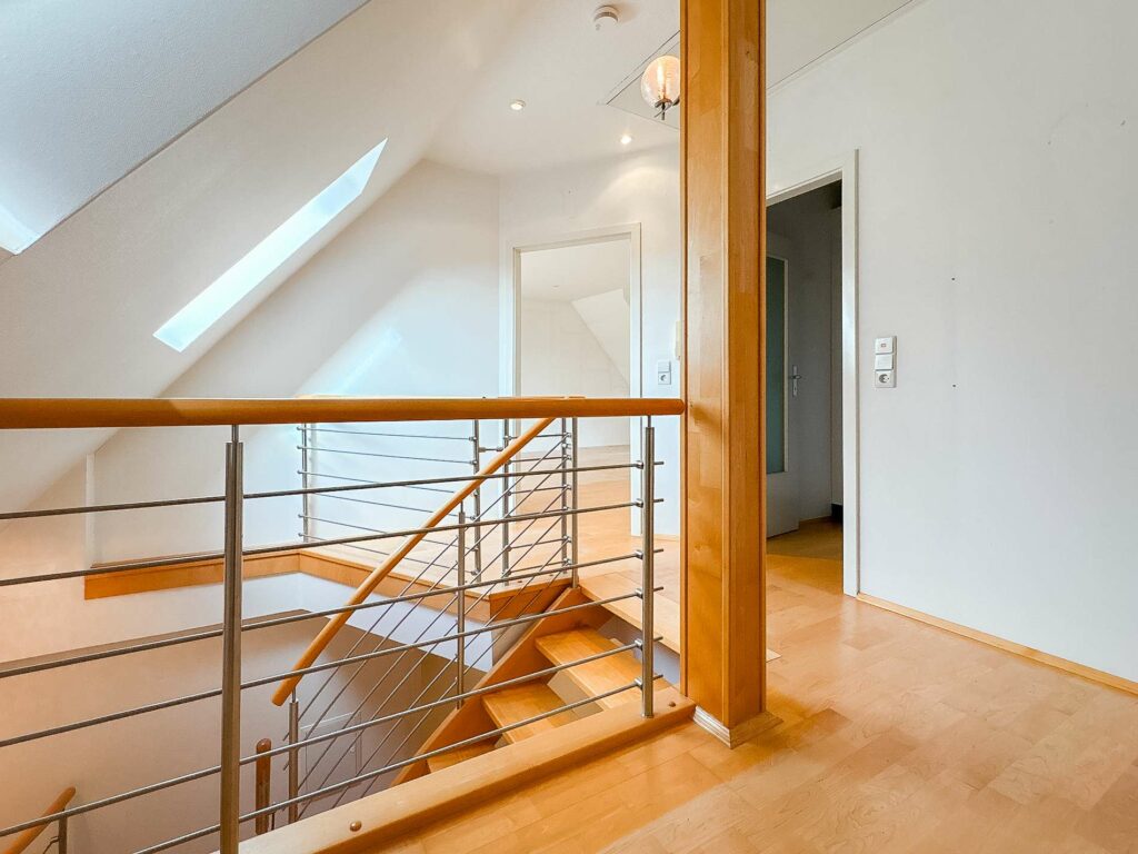 Im Obergeschoss befindet sich darüber hinaus ein zweiter Zugang, der zur Maisonettewohnung im Ober- und Dachgeschoss führt. Im unteren Bereich liegen ein Schlafzimmer und ein Duschbad. Eine geschwungene Holztreppe verbindet diesen mit dem Dachgeschoss, wo sich eine helle Küche mit Einbauküche und der angrenzende Wohnbereich befinden. Das durchgehende Parkett verleiht der Wohnung einen harmonischen Gesamteindruck.