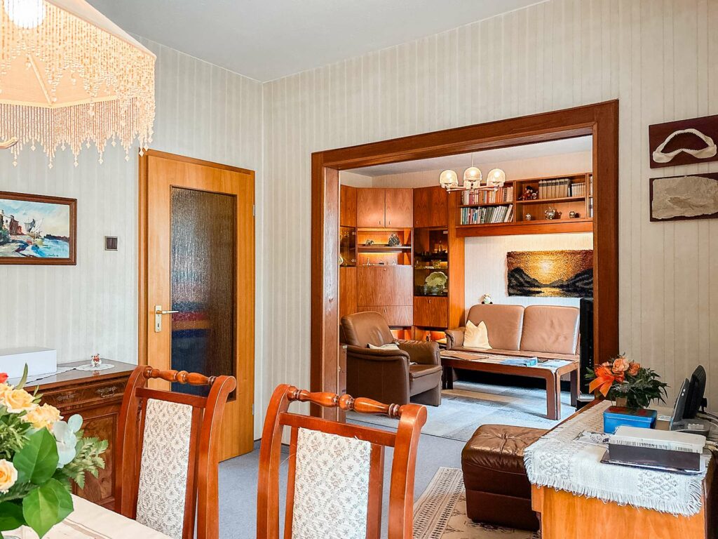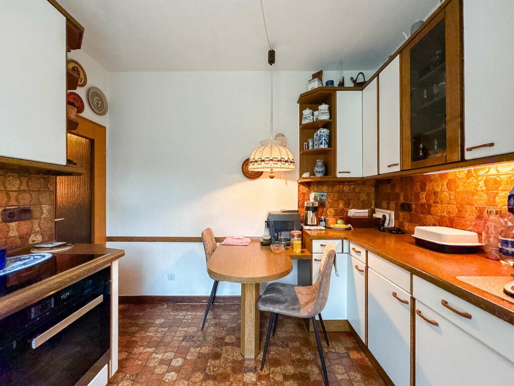 Die Erdgeschosswohnung präsentiert sich in klassischem Stil. Ein zentraler Flur verbindet alle Räume und sorgt für eine angenehme Struktur. Die Küche ist mit einer Einbauküche ausgestattet und bietet ausreichend Platz für den täglichen Bedarf. Das Schlafzimmer ist großzügig geschnitten und hell. Wohn- und Essbereich sind durch einen Durchgang verbunden und schaffen ein offenes Raumgefühl. Das Tageslichtbad mit Dusche ist funktional gestaltet. Zur Wohnung gehören außerdem zwei Zimmer im Obergeschoss, die über das allgemeine Treppenhaus erreichbar sind, ideal als zusätzliche Schlaf- oder Arbeitsräume. Die Wohnung, einschließlich der beiden Zimmer im Obergeschoss, ist vermietet.