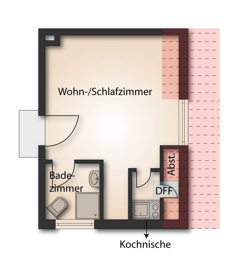 Das Badezimmer verfügt über eine Dusche und ein Fenster, das für Tageslicht und frische Luft sorgt. Die Wohnung eignet sich ideal für Singles oder Berufspendler, die eine kompakte und gepflegte Wohnung in ruhiger Lage suchen.