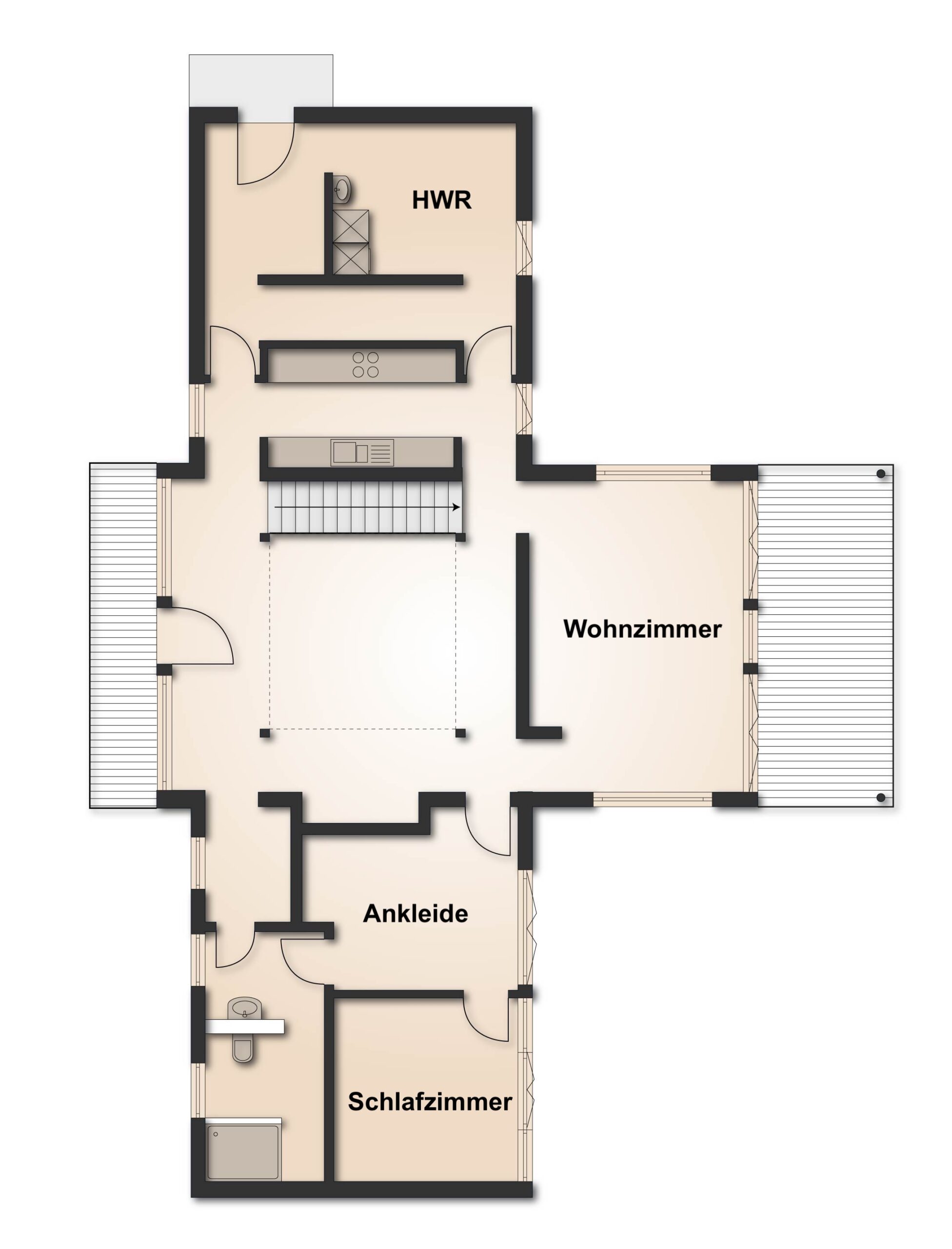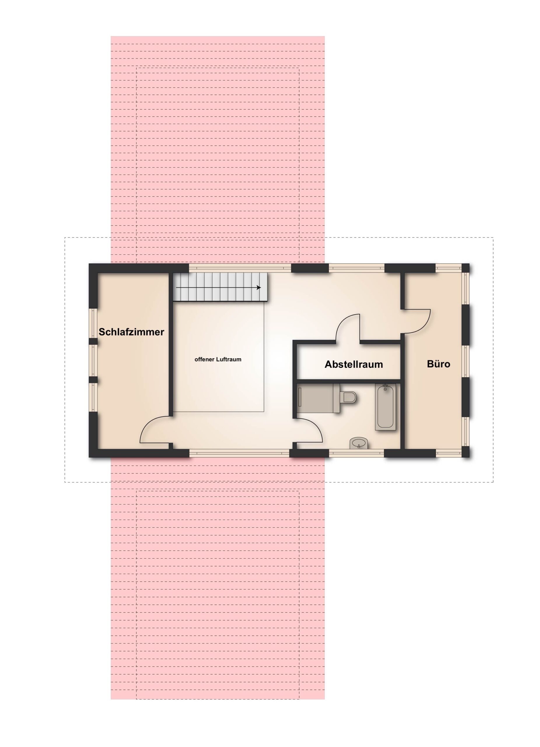 Im Obergeschoss erwarten Sie zwei helle Schlafzimmer sowie ein modernes Badezimmer mit Badewanne. Ein zusätzlicher Abstellraum sorgt für praktischen Stauraum. Die Galerie verleiht dem Obergeschoss eine offene und elegante Atmosphäre.