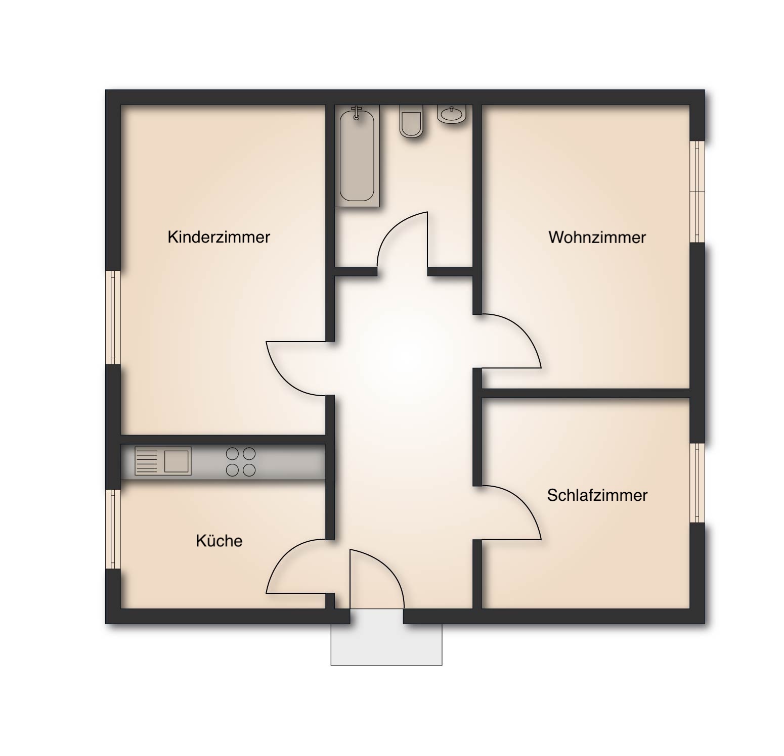 Die Wohnung überzeugt durch einen durchdachten Grundriss: Vom zentral gelegenen Flur aus sind sämtliche Räume bequem erreichbar. Die separate Küche mit Fenster bietet angenehme Lichtverhältnisse und ausreichend Platz für einen kleinen Essbereich. Neben einem vielseitig nutzbaren Kinder- oder Arbeitszimmer und einem hell gefliesten Badezimmer verfügt die Wohnung über ein großzügiges Wohnzimmer mit idealer Möglichkeit zur Kombination von Wohn- und Essbereich. Ein ruhiges Schlafzimmer ergänzt das stimmige Raumkonzept.